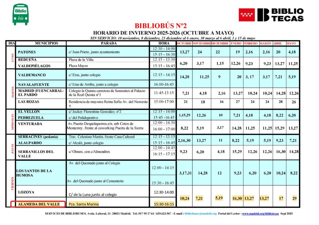 Bibliobus El Bibliobús para en Alameda del Valle en la Plaza de Santa Marina en los siguientes horarios: